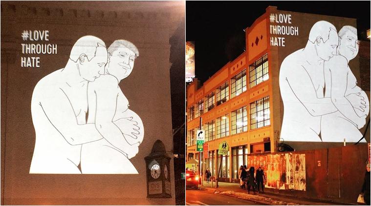 The image of Putin embracing Donald Trump from behind was projected on some buildings in New York and in the neighbourhoods Williamsburg and Chelsea with hashtag #LoveThroughHate. Not only the image shows the two presidents in love, sharing an intimate moment in nude, it also shows that they are expecting a child! Yes, the picture shows Trump flaunting his baby bump, while Putin showing him with affection.