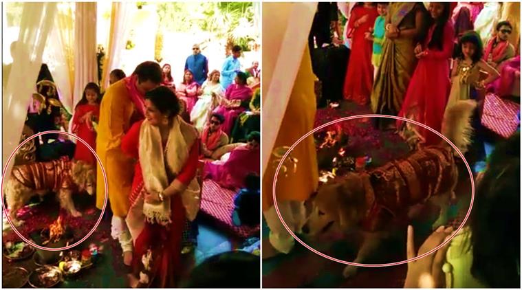 dog taking pheras, dog behind indian couple, dog takes pheras with bride and groom, pet dog at wedding, dog videos, dog funny videos, dog wedding videos, indian express, indian express news
